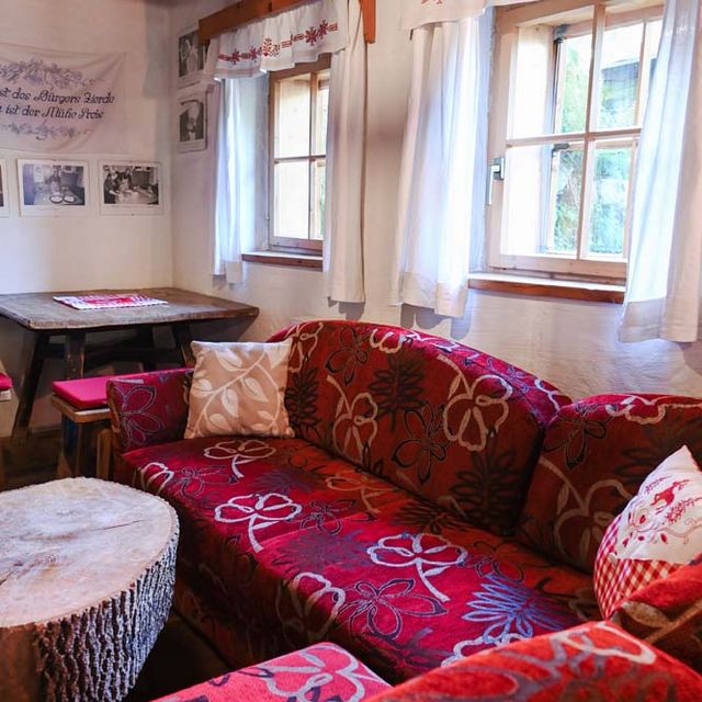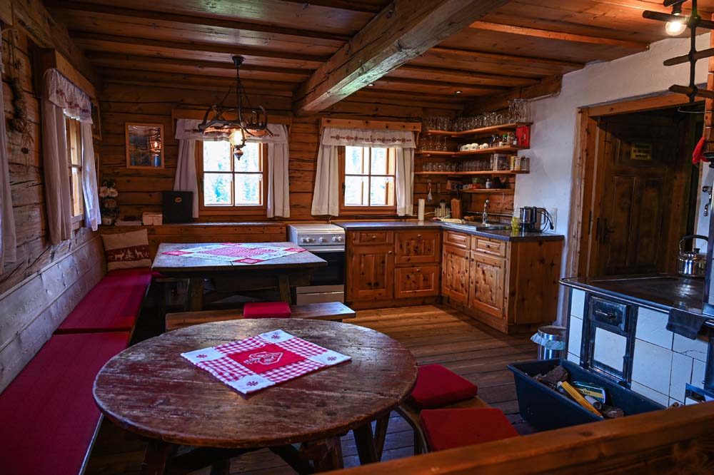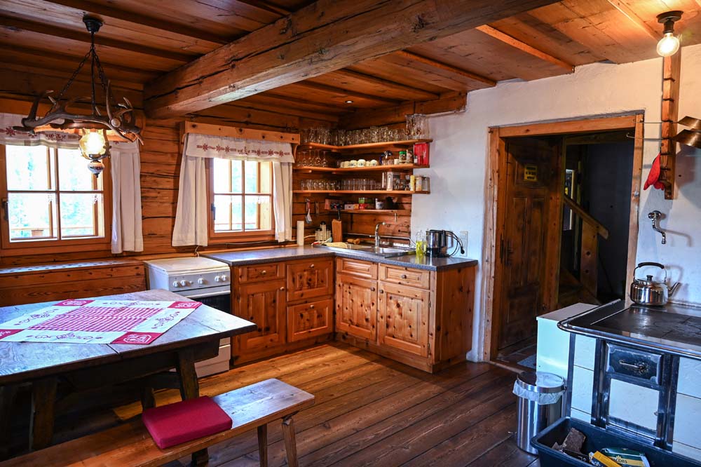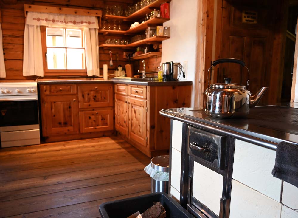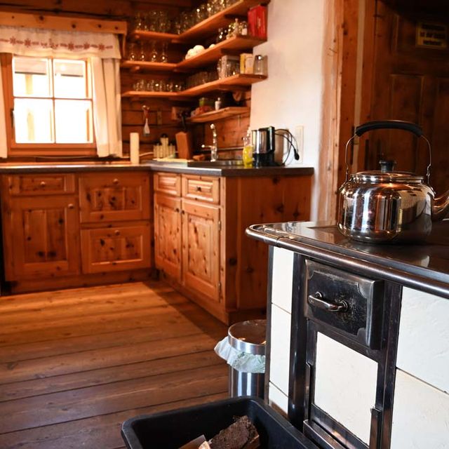 Die Küche bietet Ihnen alles, was Sie für die Versorgung von bis zu 20 Personen brauchen. Das Zentrum bildet der gemauerte Herd mit großer Eisenplatte zum Kochen, den Sie selber mit Holz befeuern. Er ist zugleich Kachelofen, der dem Wohnbereich seine gemütliche Wärme schenkt. Weiters steht Ihnen ein Gasherd mit Backrohr zur Verfügung und bei Bedarf ein Wasserkocher, der mit Strom betrieben wird. Zwei große, alte Holztische bieten bequem Platz zum Essen. Im "Wohnzimmer" können Sie sich gemütlich auf einem Ecksofa niederlassen, das auch zu einem Bett umgebaut werden kann. Das ist der richtige Platz, um abends mal ein Buch zu lesen, ein Spiel zu spielen oder einen schönen Film im Fernsehen anzuschauen.