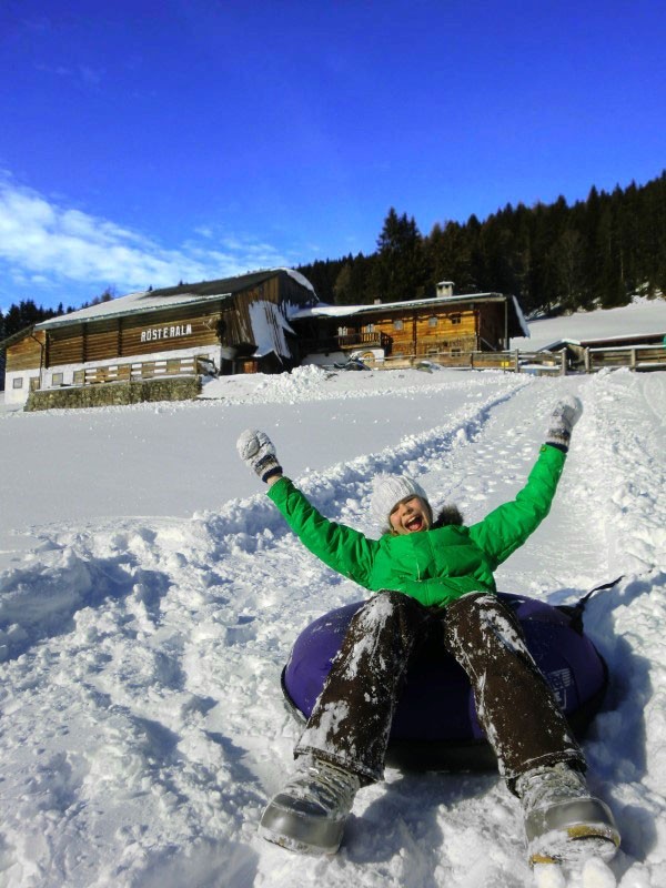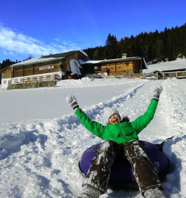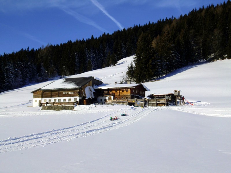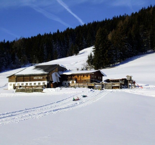 Wer nach seiner Einkehr zurück ins Tal muss, kann sich bei der Hütte eine Rodel ausleihen und damit auf dem präparierten Forstweg wieder bis zum Stoanerhof hinabsausen. Für unsere Stammgäste ist die Talfahrt stets das Highlight des abenteuerlichen Rösteralm-Besuchs.